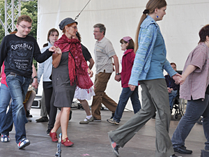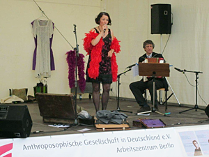 Ringsherum wogte freundlich-entspanntes Leben, man flanierte, staunte, aß und trank, experimentierte und bastelte, las und lauschte, kaufte und bekam aber vor allem geschenkt nach allen Regeln der Kunst: anthroposophische Lebenskultur. Hinter dem Stand war vor dem Stand, hier verkehrte man barrierefrei miteinander, die aktiven Insider wechselten im wahren Sinne des Wortes ihre Standpunkte und damit Perspektiven nach Lust und Laune. Waldorfschüler, Demeter-Landwirte, anthroposophische Ärzte, Therapeuten und Banker, Künstler, Musiker, Bäcker und Buchhändler, Bewohner und Betreuer von Behinderteneinrichtungen und -werkstätten, Waldorfkindergärtnerinnen, Seniorenheimbewohner, Eltern, Kinder, Paare und Einzelgänger waren am Stand oder auf und vor der Bühne Aktionisten und Gäste zugleich. Aber auch neugierige Touristen und wissbegierige Berliner, „die keine Ahnung hatten“, zeigten: Ja, es gab sie dort ebenfalls, die Öffentlichkeit, und das Ganze war sicher überwiegend, aber nicht nur ein Fest für die Darsteller selbst.